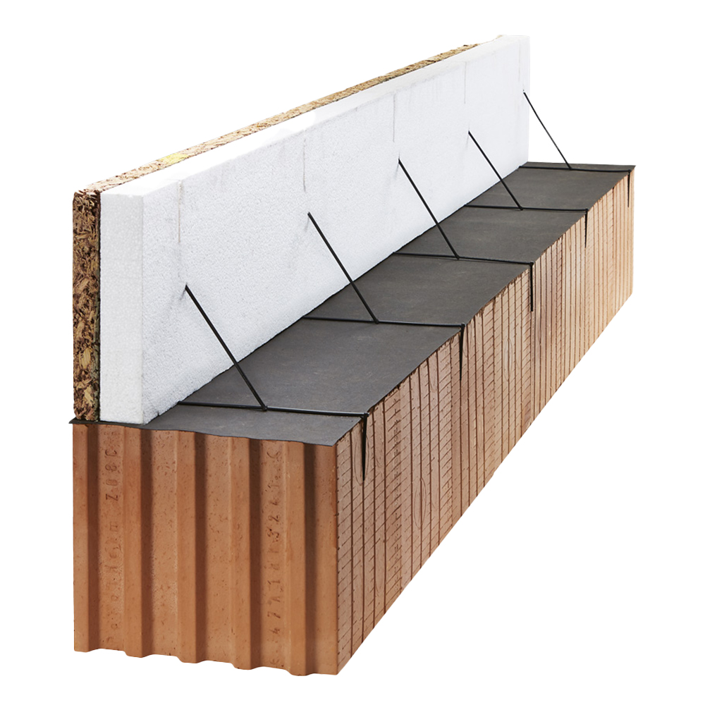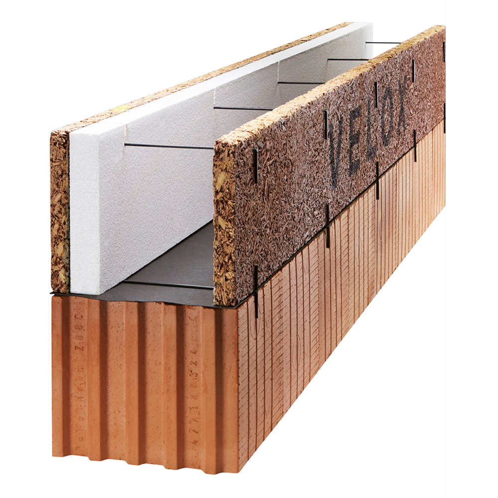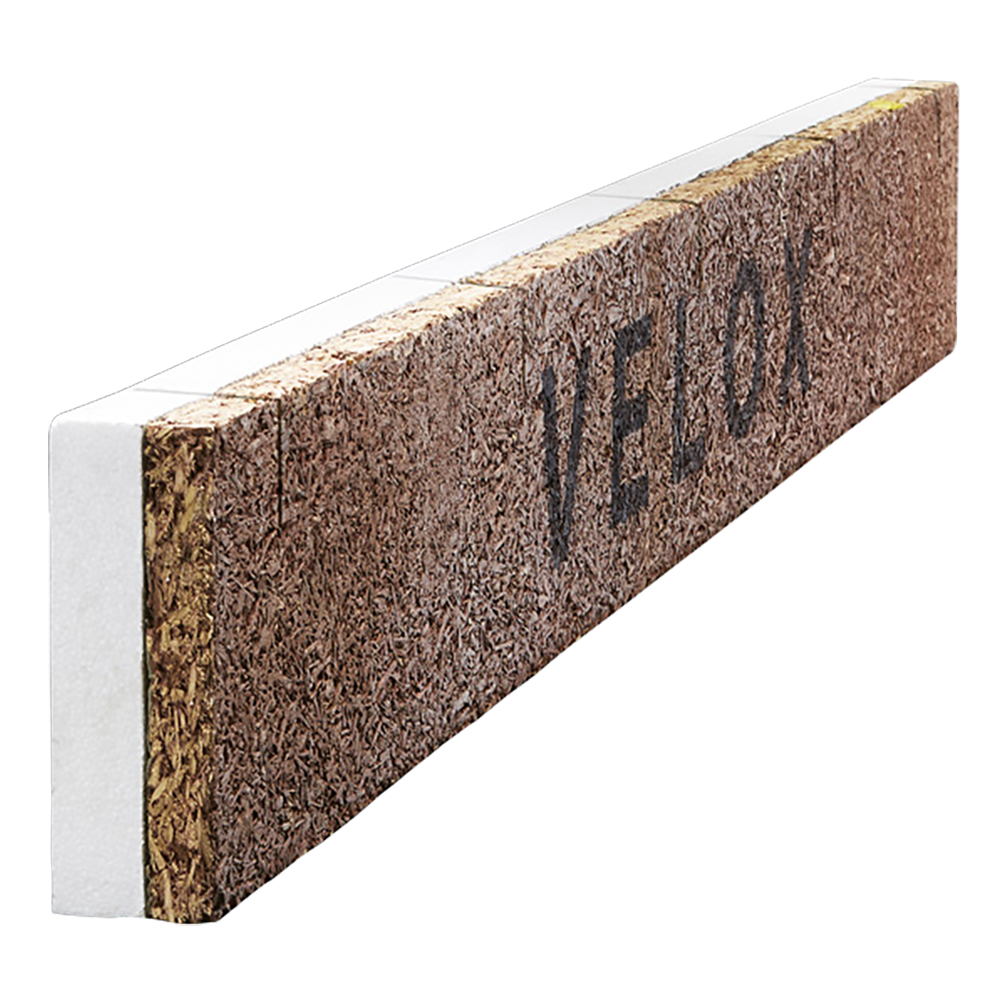 Štěpkocementová věncová deska se zářezy tl. 135 mm, kombinující věncovou desku WSC 35 a polystyren tl. 100 mm, určená pro jednostranné nebo oboustranné bednění věnců.